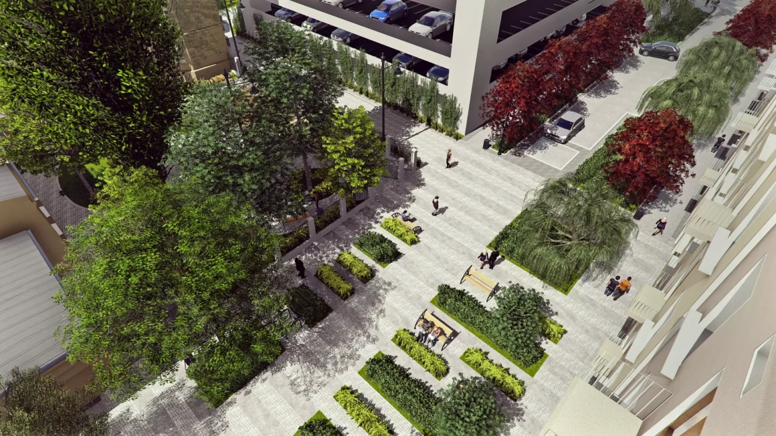 The roadway and sidewalks will be separated from each other by green areas and street furniture, curbs and steps have been adapted to the needs of people with disabilities.