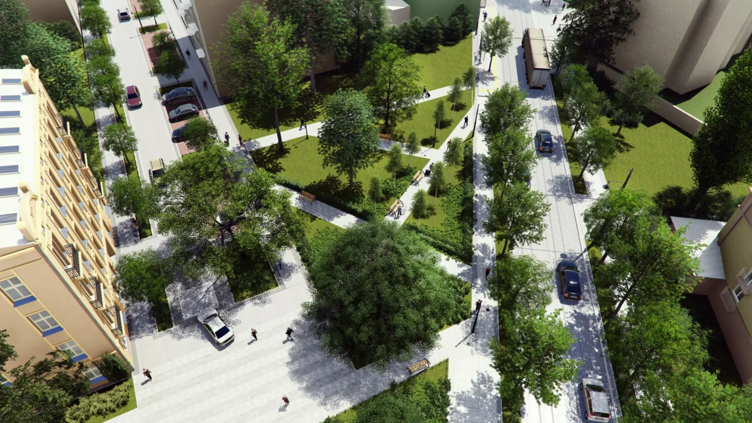 Gray parking spaces, entrances to properties, and crossings will be separated by trees and greenery. The existing tree avenue will be organized – some trees will be pruned or transplanted, new plantings will appear, and additionally, an irrigation system and lighting will be installed.